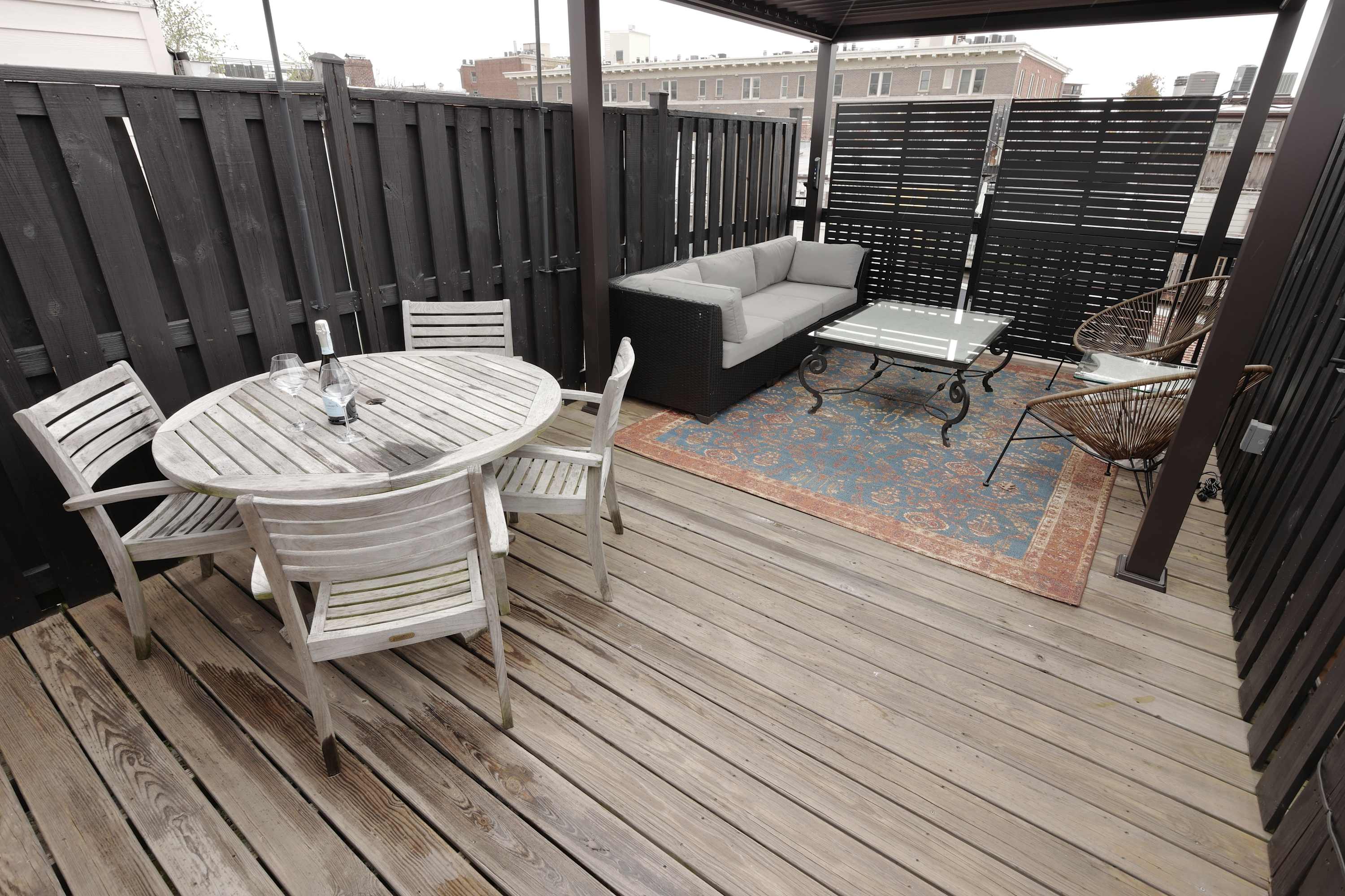 The bathroom feels truly luxe, with heated floors, a Japanese‑style toilet, and high‑end finishes throughout. Just beyond the French doors, your completely private roof deck steals the show, with lounge seating, outdoor dining for four, and mosquito nets on windows and doors so you can enjoy fresh air without bugs.
