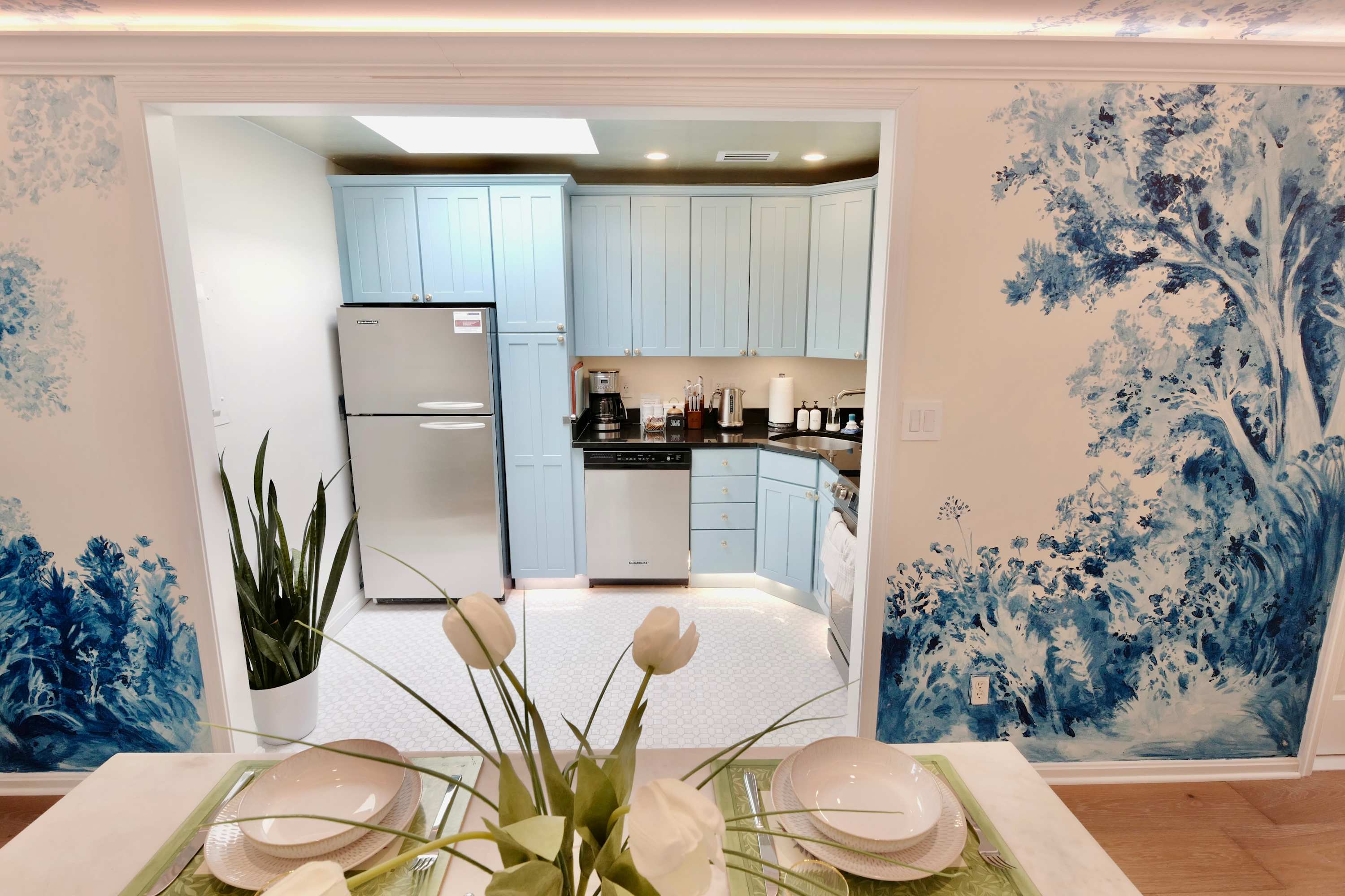 In the main living area, a chic seating zone and gallery‑style art wall create a cozy place to read, plan your day, or unwind in the evening. The dining table seats four, perfect for morning coffee, takeout from U Street, or casual dinners in.